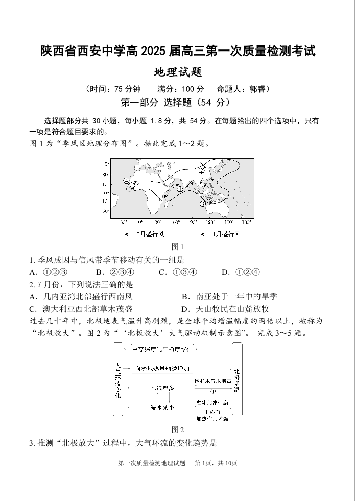 陕西省西安中学高2025届高三第一次质量检测考试地理