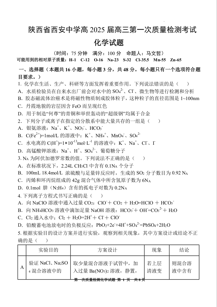 陕西省西安中学高2025届高三第一次质量检测考试化学