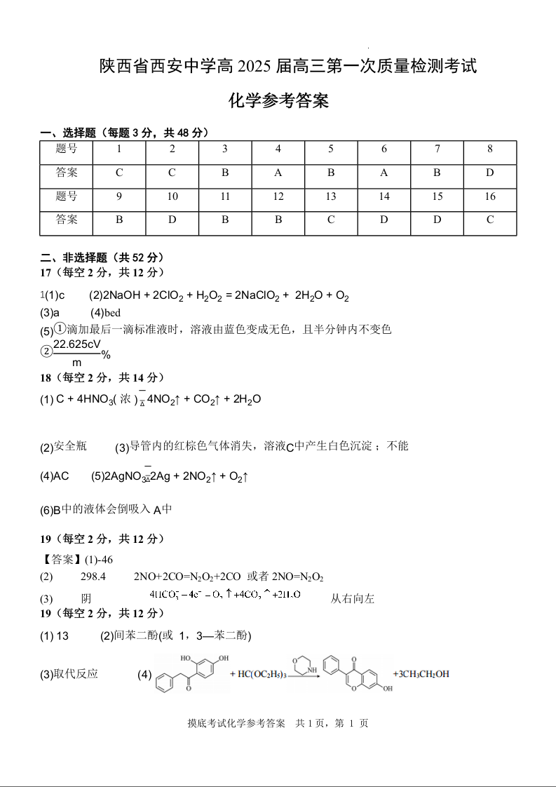 陕西省西安中学高2025届高三第一次质量检测考试化学答案