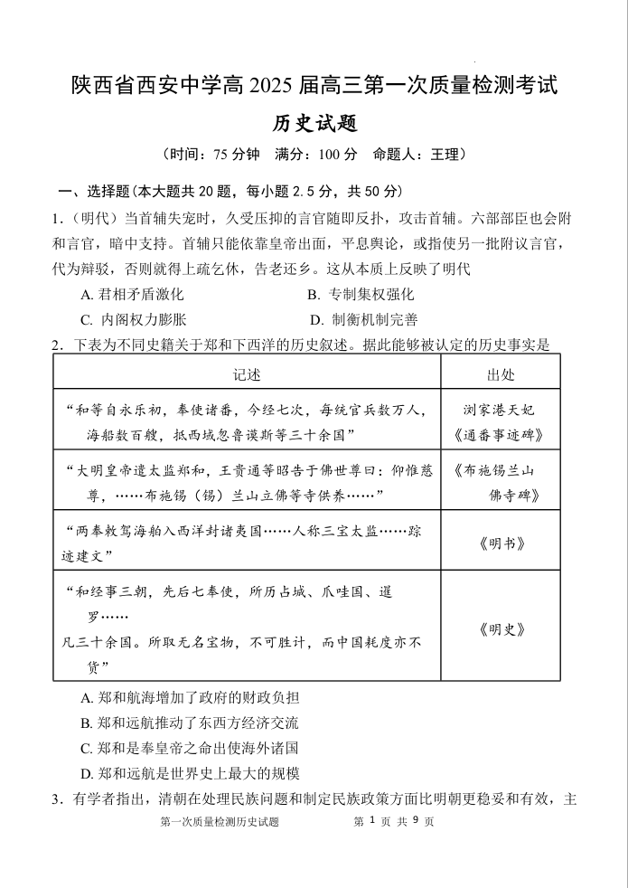 陕西省西安中学高2025届高三第一次质量检测考试历史