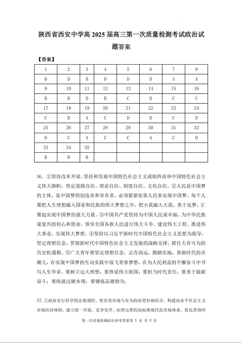 陕西省西安中学高2025届高三第一次质量检测考试政治答案