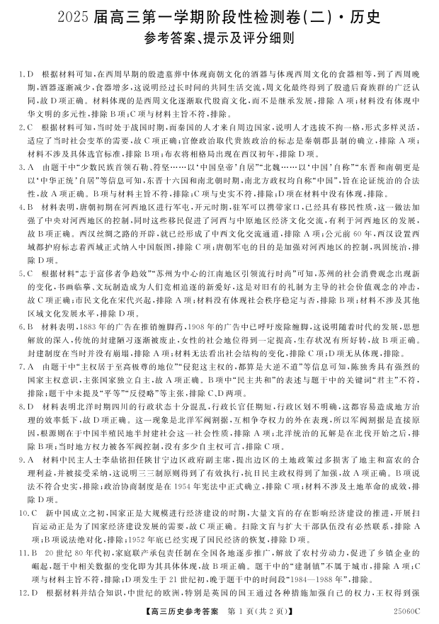 2025届陕西省教育联盟高三上学期第二次阶段性检测历史答案