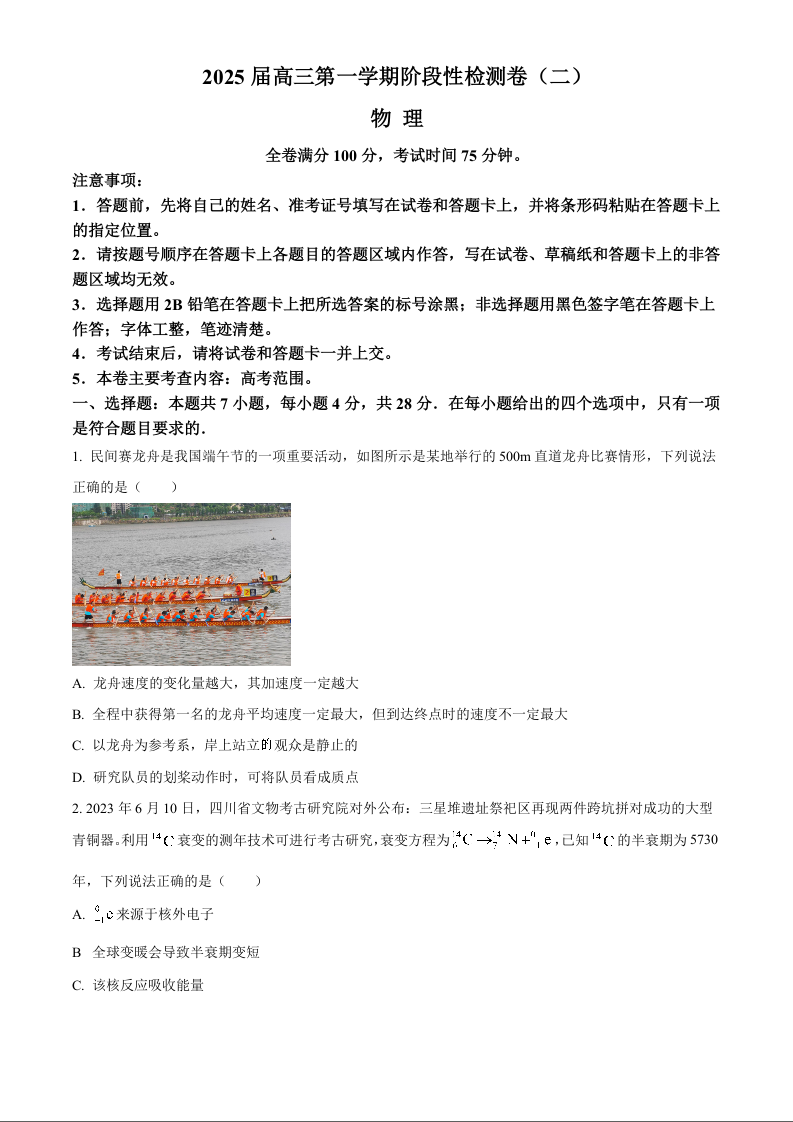 2025届陕西省教育联盟高三上学期第二次阶段性检测物理+答案