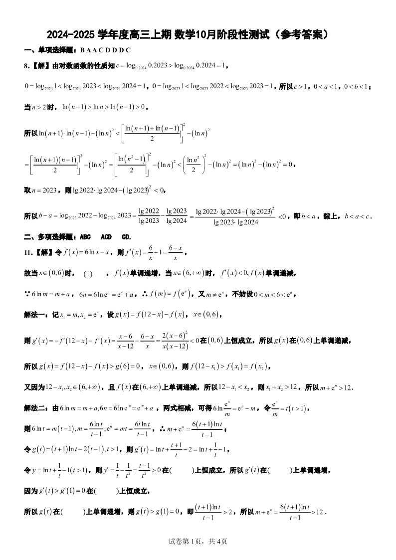 四川省成都市第七中学2024-2025学年高三上学期10月月考数学试题答案