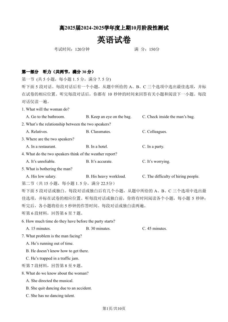 四川省成都市第七中学2024-2025学年高三上学期10月月考英语试题