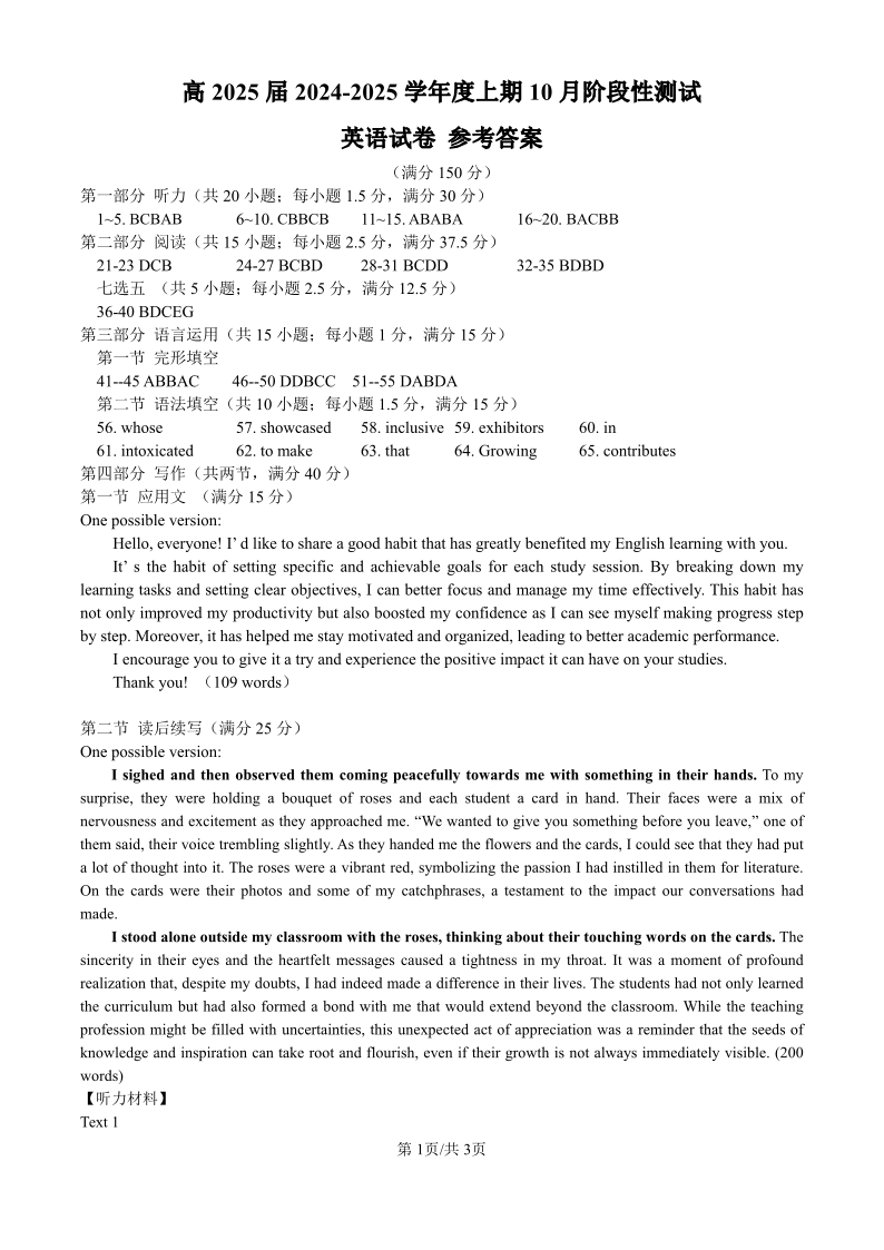 四川省成都市第七中学2024-2025学年高三上学期10月月考英语试题答案