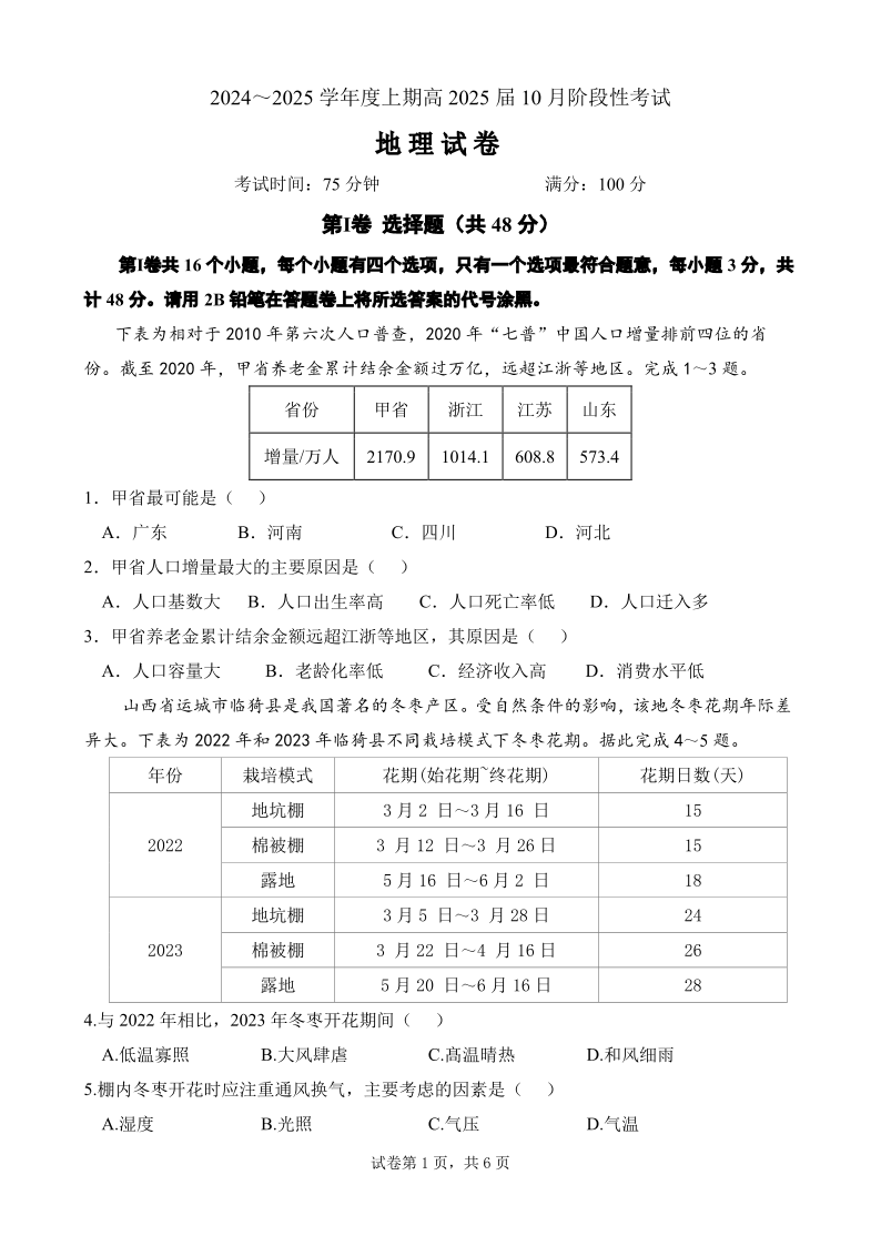 四川省成都市第七中学2024-2025学年高三上学期10月月考地理试题