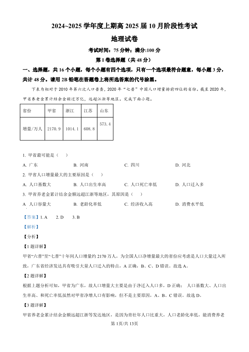四川省成都市第七中学2024-2025学年高三上学期10月月考地理试题答案