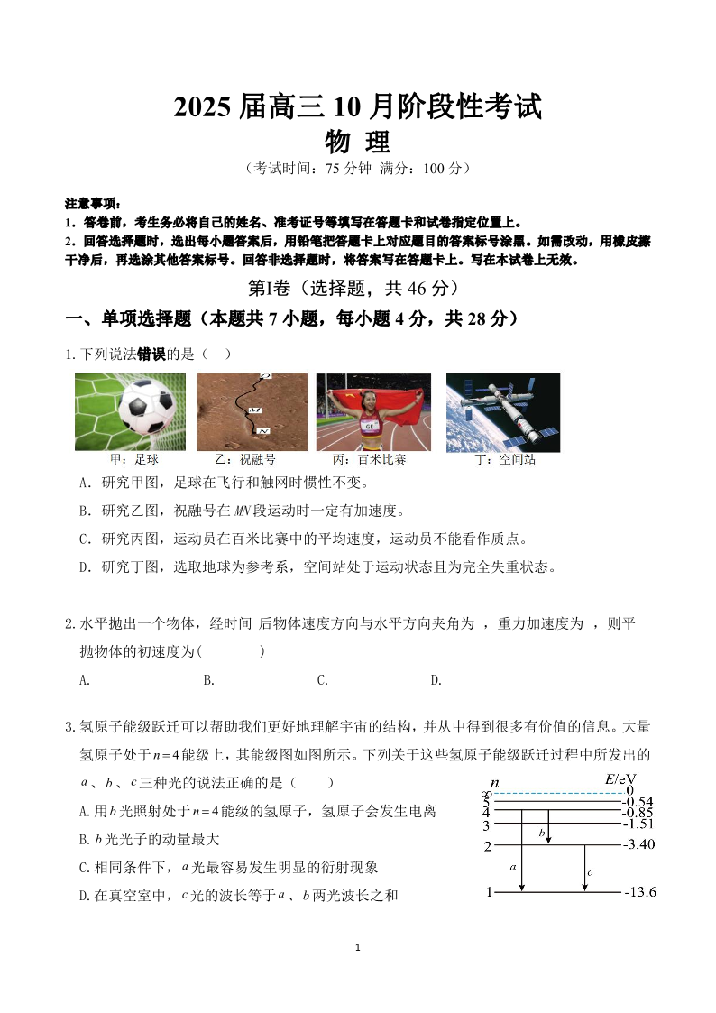 四川省成都市第七中学2024-2025学年高三上学期10月月考物理试题