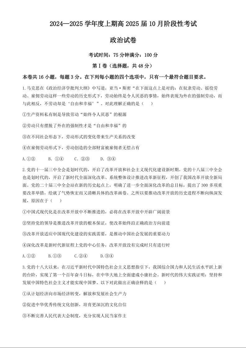 四川省成都市第七中学2025届高三上学期10月月考政治+答案
