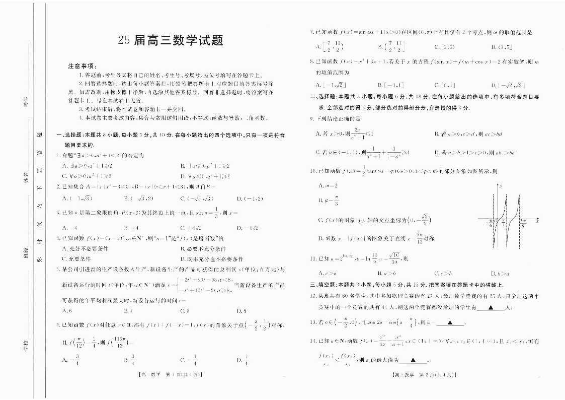 四川省2025届高三部分高中10月联考数学