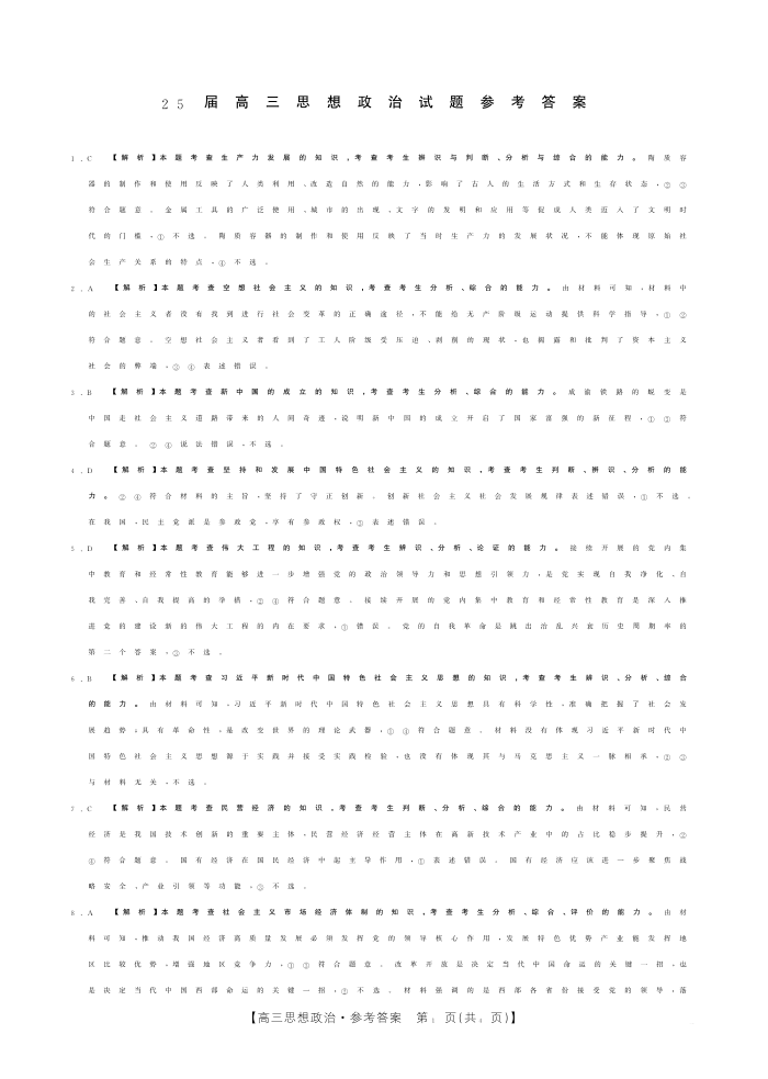 四川省2025届高三部分高中10月联考政治答案