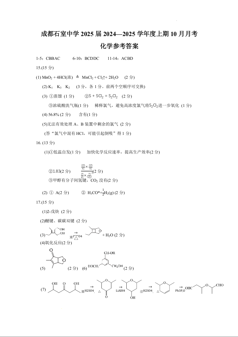 四川省成都市石室中学2024-2025年学度上期高2025届10月考试化学答案