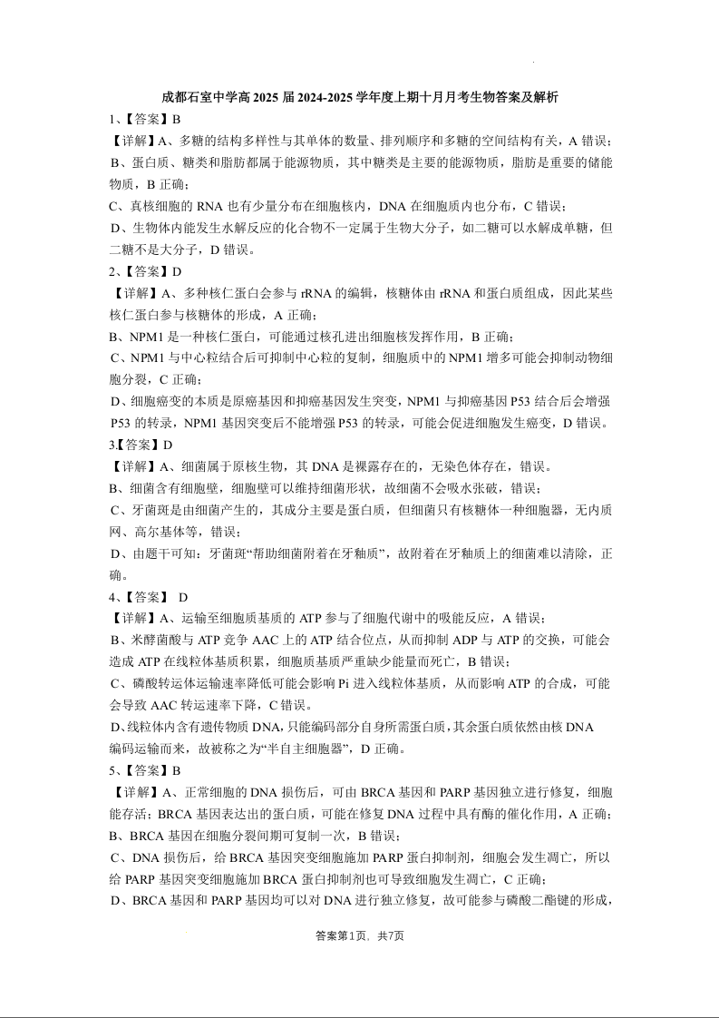 四川省成都市石室中学2024-2025年学度上期高2025届10月考试生物答案