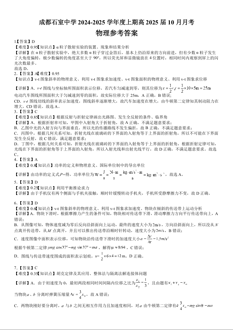 四川省成都市石室中学2024-2025年学度上期高2025届10月考试物理答案