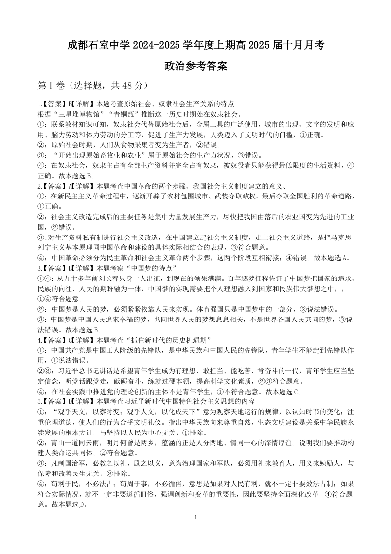 四川省成都市石室中学2024-2025年学度上期高2025届10月考试政治答案