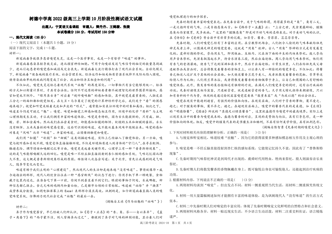四川省成都市树德中学高2022级高三上学期10月阶段性测试语文+答案