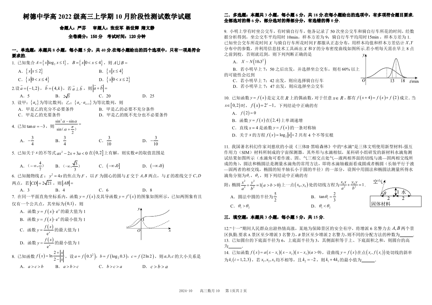 四川省成都市树德中学高2022级高三上学期10月阶段性测试数学+答案