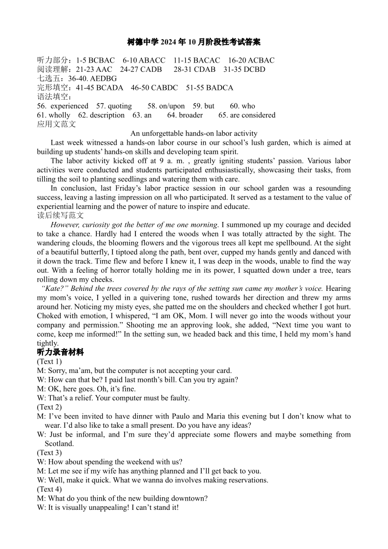四川省成都市树德中学高2022级高三上学期10月阶段性测试英语答案