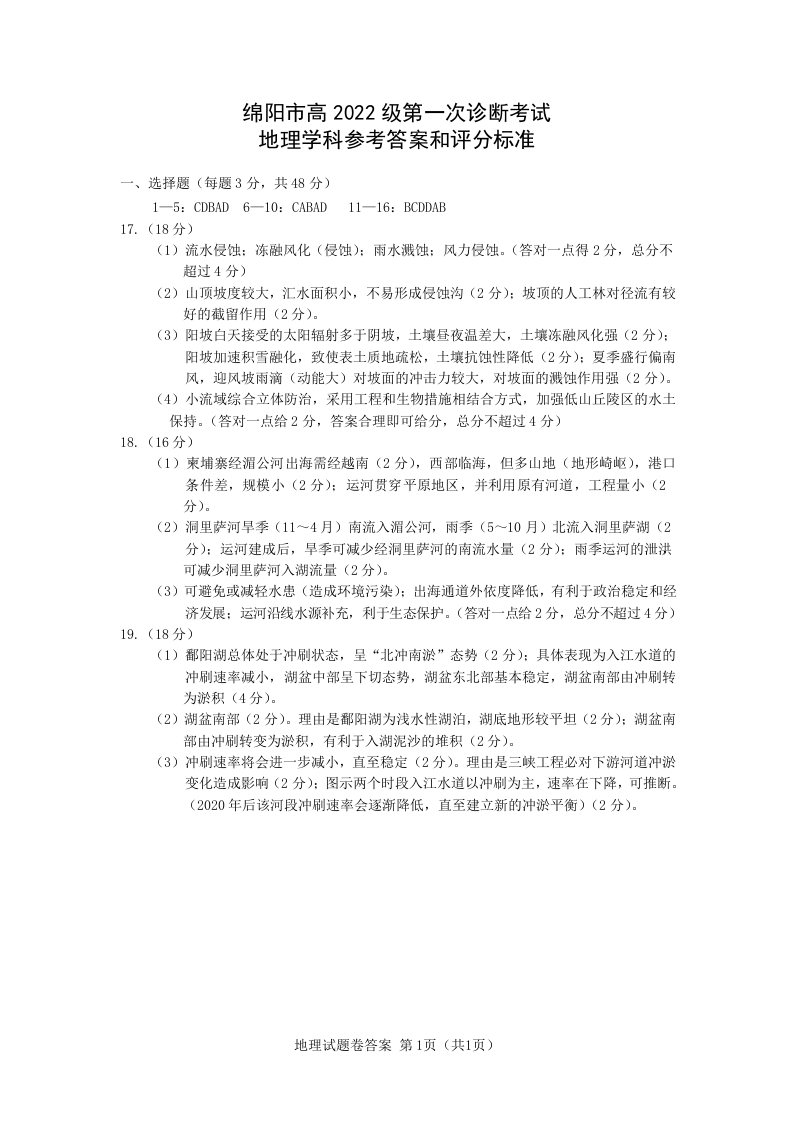绵阳市高中2022级第一次诊断性考试地理答案