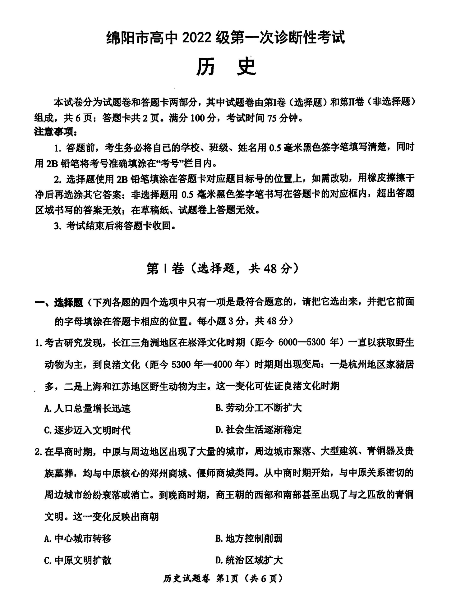 绵阳市高中2022级第一次诊断性考试历史