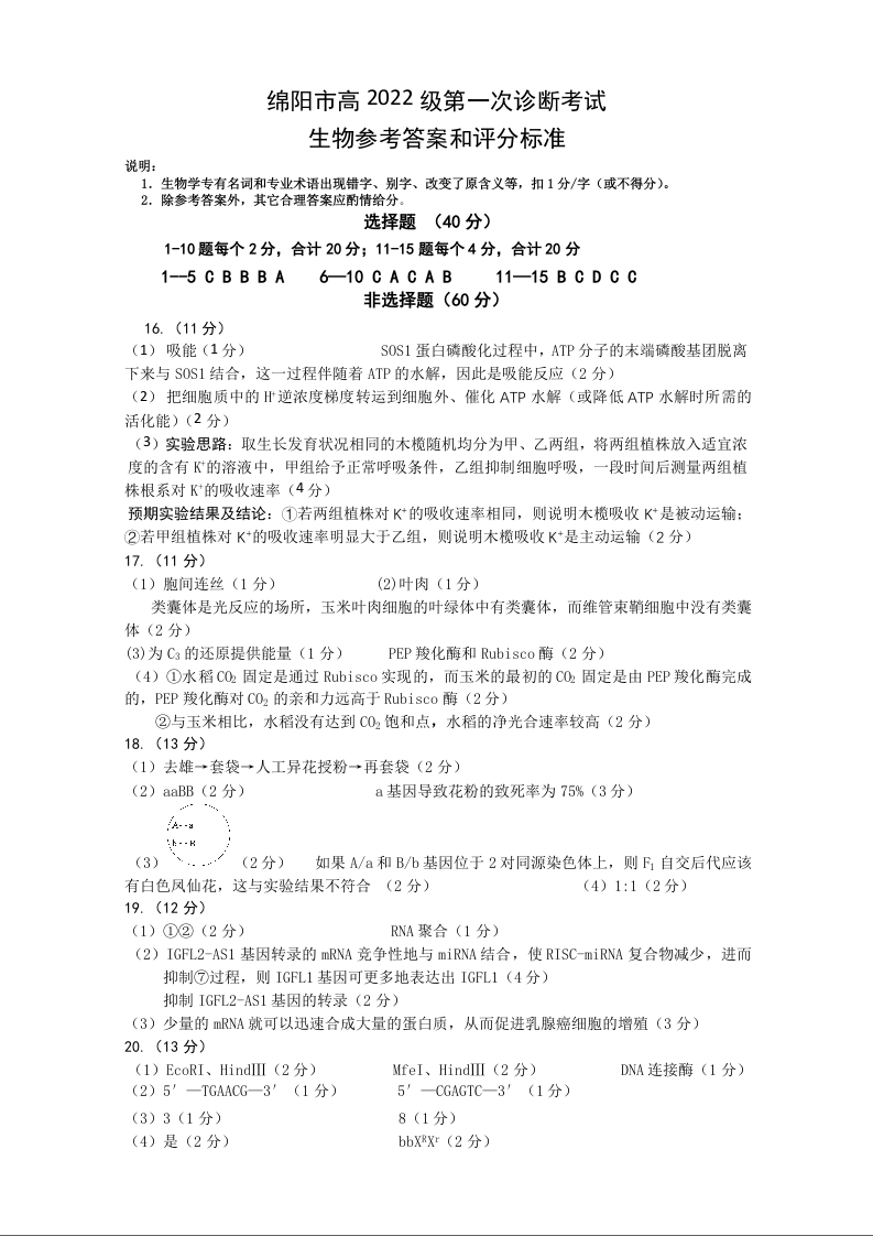 绵阳市高中2022级第一次诊断性考试生物答案