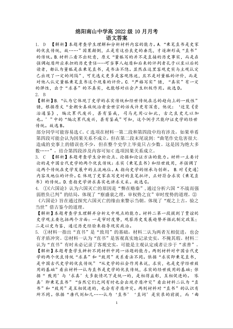 四川省绵阳市南山中学集团学校高2022级10月联考语文答案