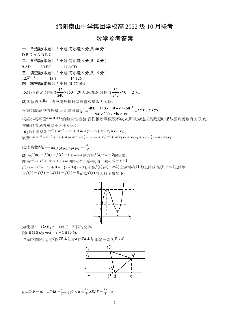 四川省绵阳市南山中学集团学校高2022级10月联考数学答案
