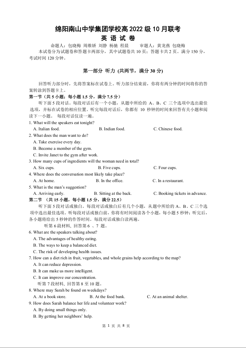 四川省绵阳市南山中学集团学校高2022级10月联考英语