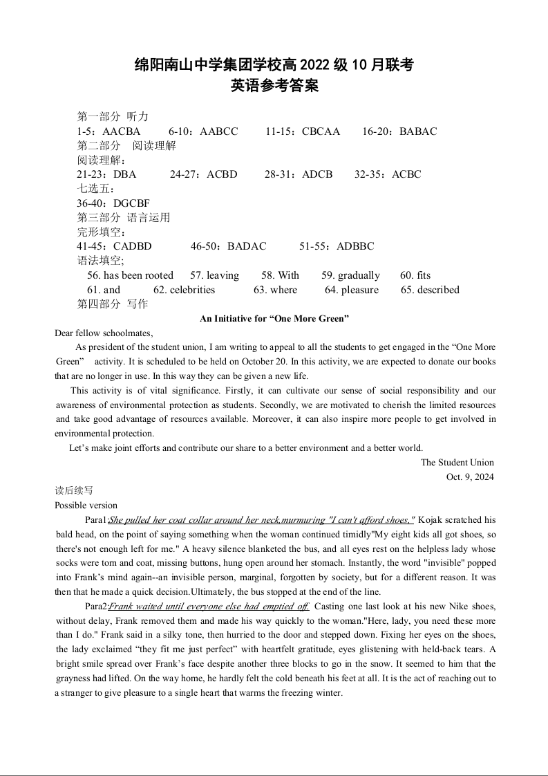 四川省绵阳市南山中学集团学校高2022级10月联考英语答案