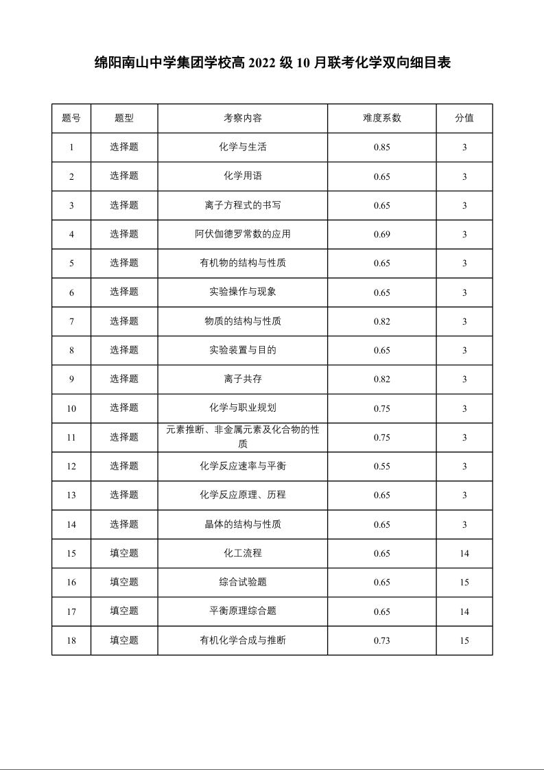 四川省绵阳市南山中学集团学校高2022级10月联考化学多维细目表