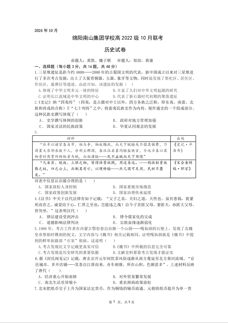四川省绵阳市南山中学集团学校高2022级10月联考历史
