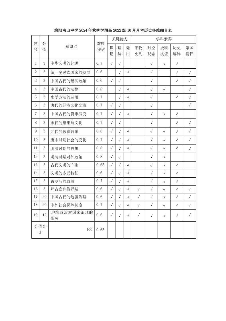 四川省绵阳市南山中学集团学校高2022级10月联考历史多维细目表