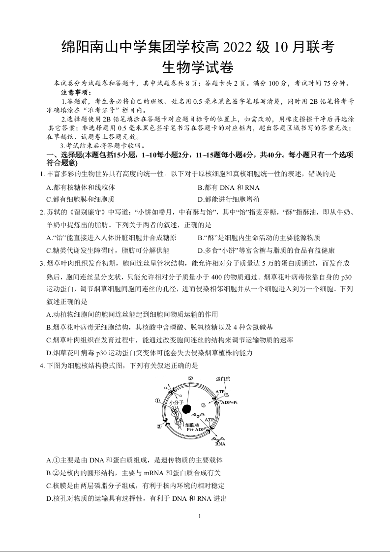 四川省绵阳市南山中学集团学校高2022级10月联考生物