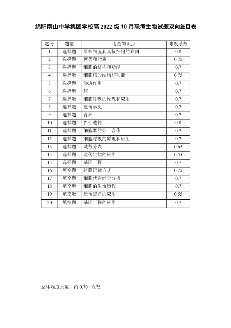 四川省绵阳市南山中学集团学校高2022级10月联考生物多维细目表