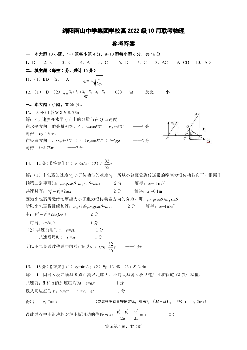 四川省绵阳市南山中学集团学校高2022级10月联考物理答案