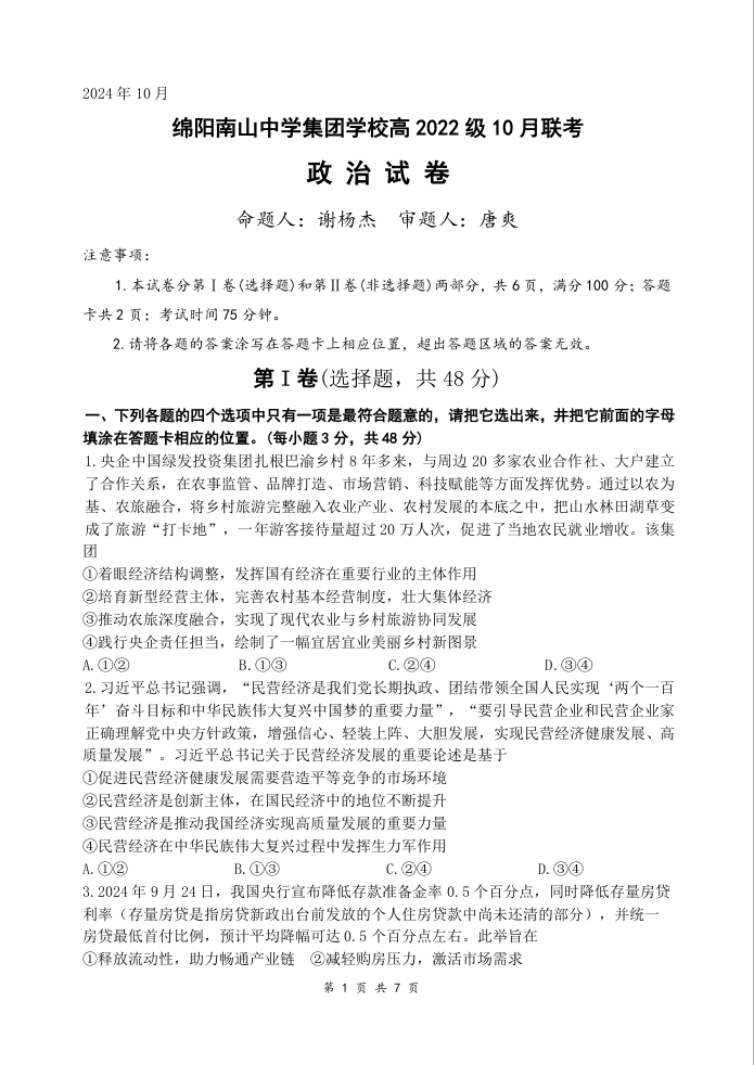 四川省绵阳市南山中学集团学校高2022级10月联考政治