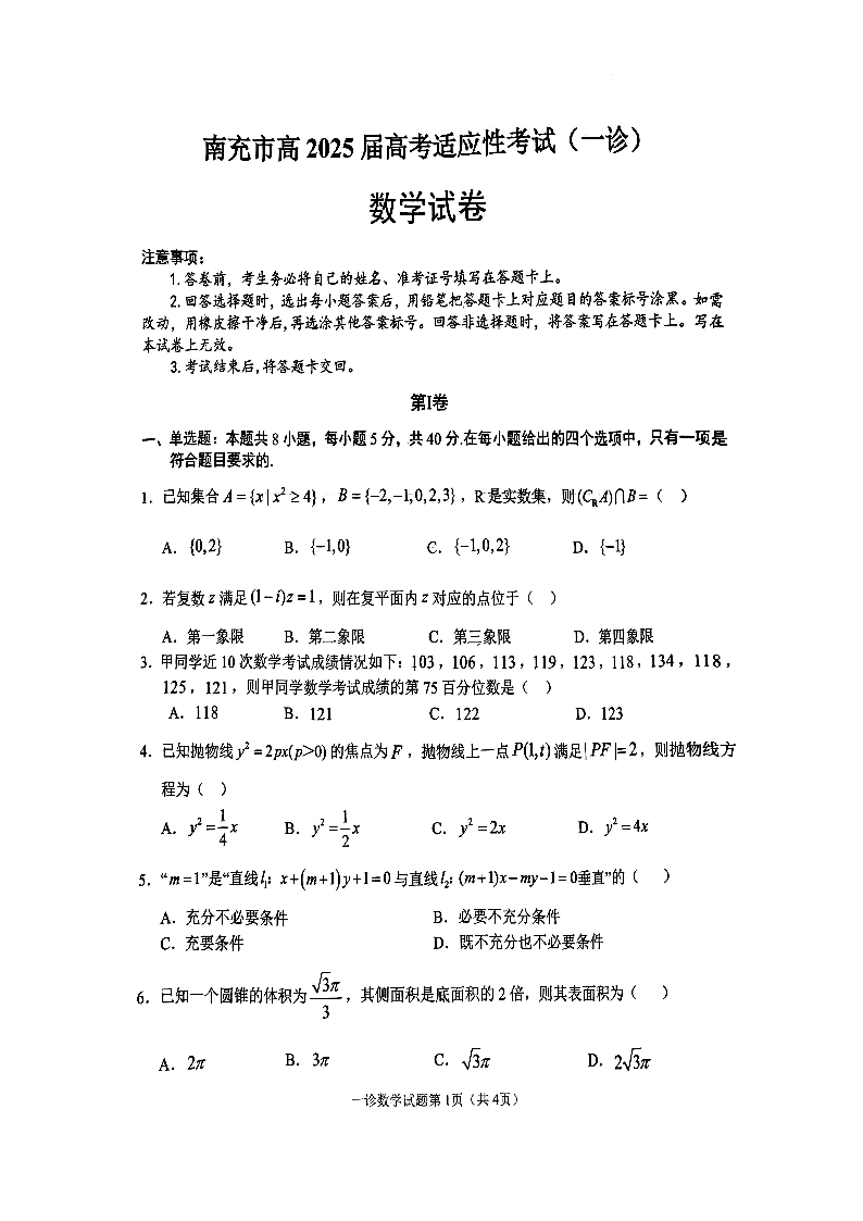 四川省南充市2025届高三高考适应性考试(一诊)数学试题