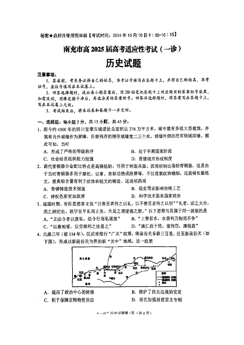 四川省南充市2025届高三高考适应性考试(一诊)历史试题