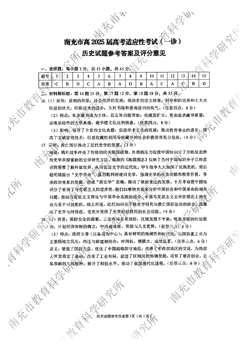 四川省南充市2025届高三高考适应性考试(一诊)历史试题答案