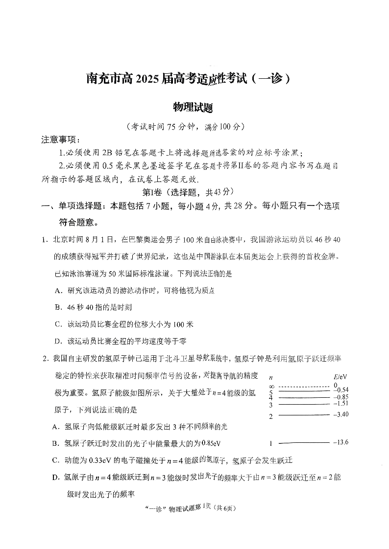 四川省南充市2025届高三高考适应性考试(一诊)物理试题