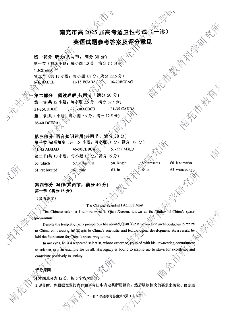 四川省南充市2025届高三高考适应性考试(一诊)英语试题答案