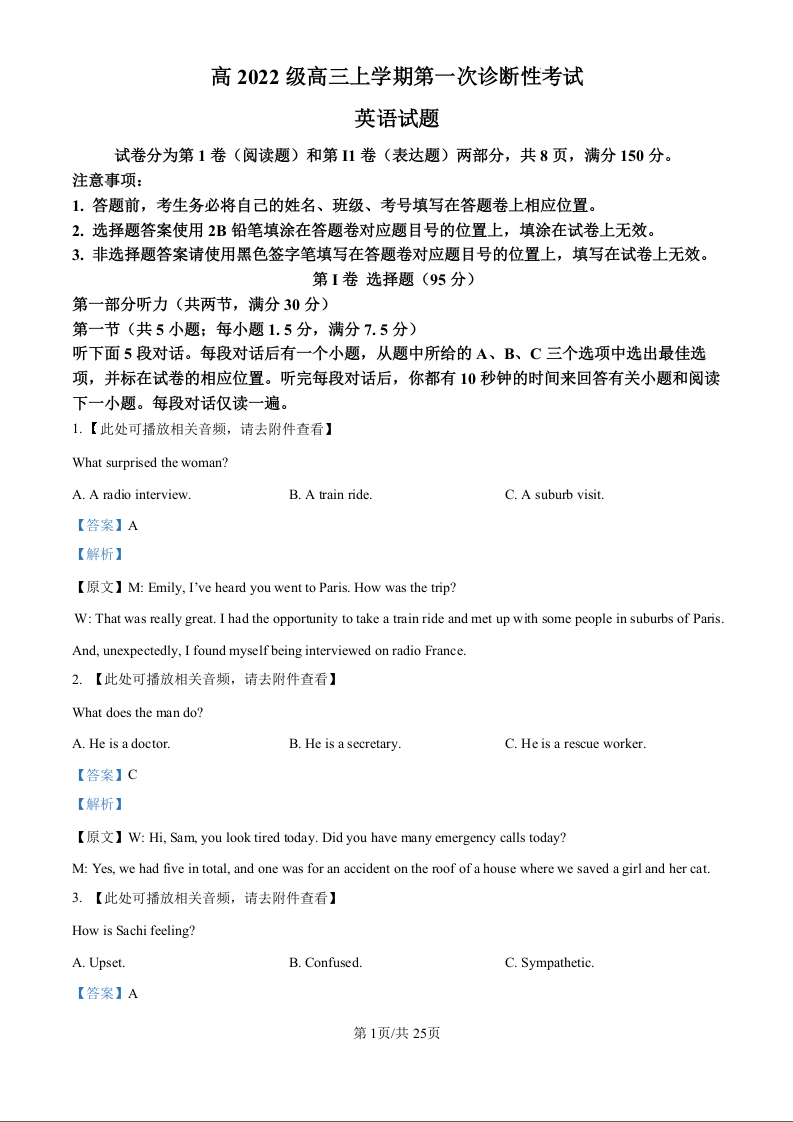 四川省宜宾市叙州区高2022级高三上学期第一次诊断考试英语试题(解析版)