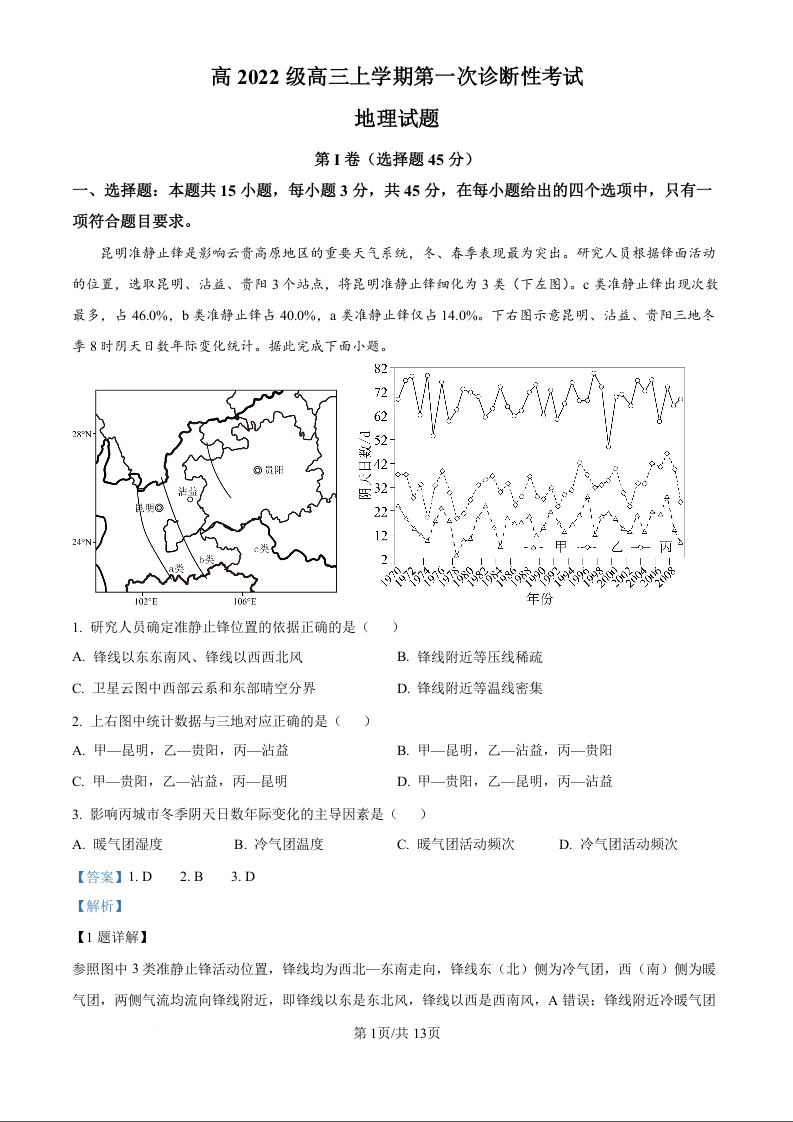 四川省宜宾市叙州区高2022级高三上学期第一次诊断考试地理试题(解析版)