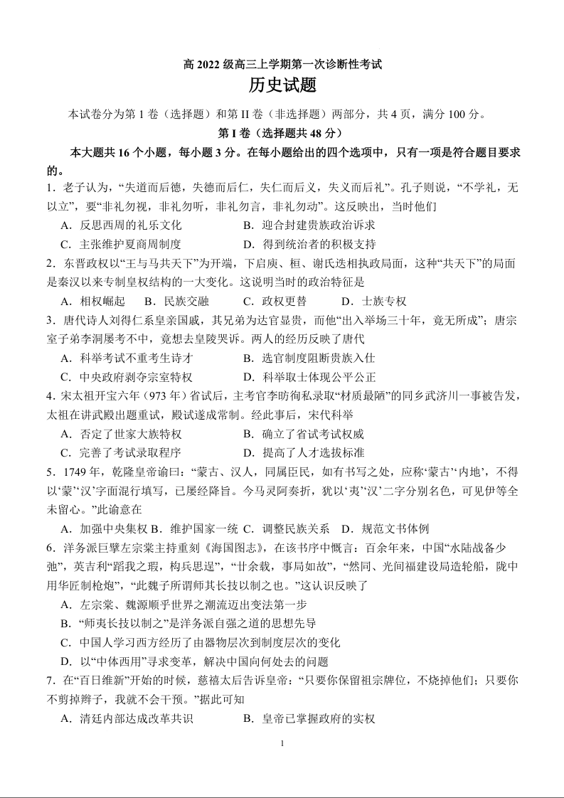 四川省宜宾市叙州区高2022级高三上学期第一次诊断考试历史试题