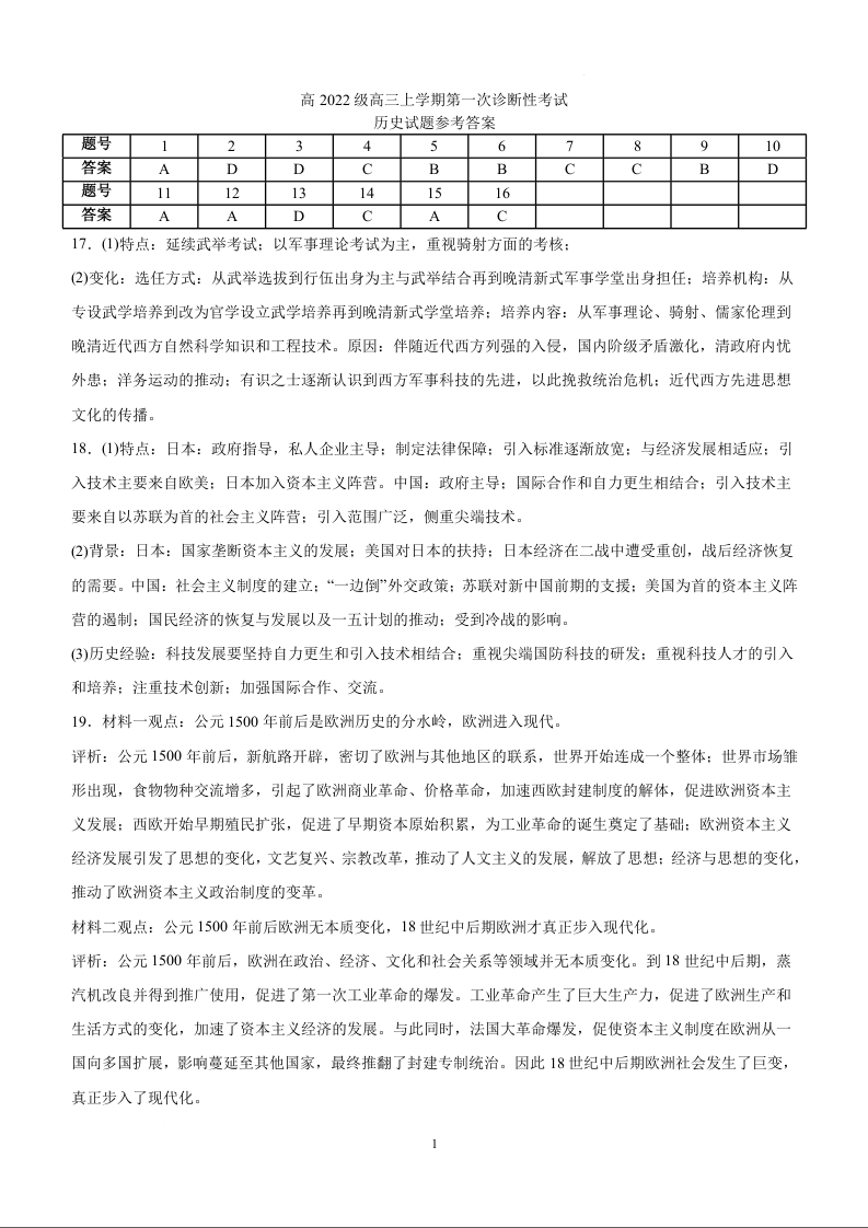 四川省宜宾市叙州区高2022级高三上学期第一次诊断考试历史试题答案
