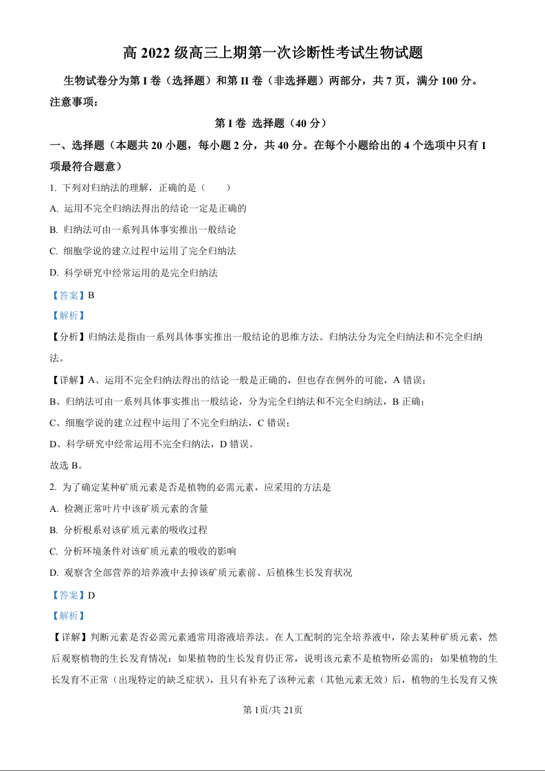 四川省宜宾市叙州区高2022级高三上学期第一次诊断考试生物试题(解析版)