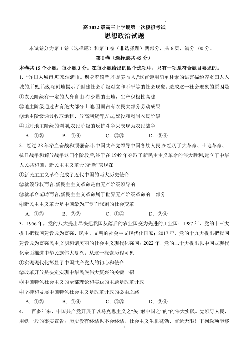四川省宜宾市叙州区高2022级高三上学期第一次诊断考试思想政治试题