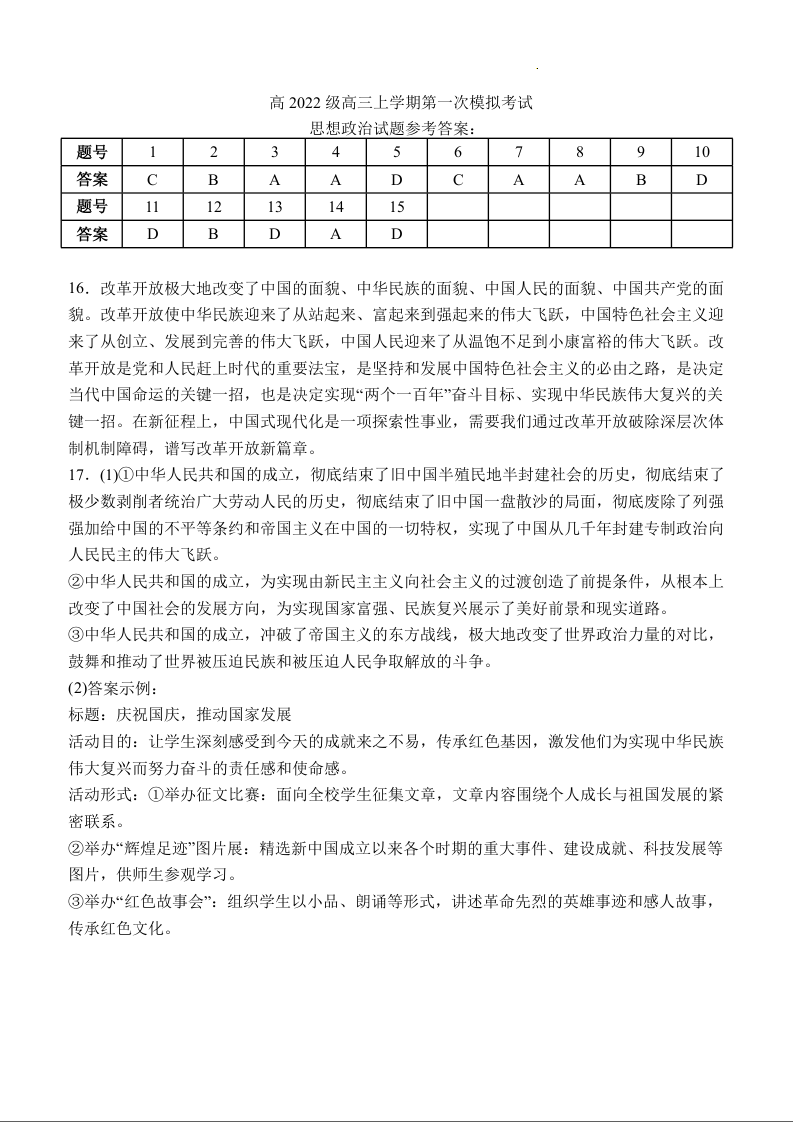 四川省宜宾市叙州区高2022级高三上学期第一次诊断考试思想政治试题答案