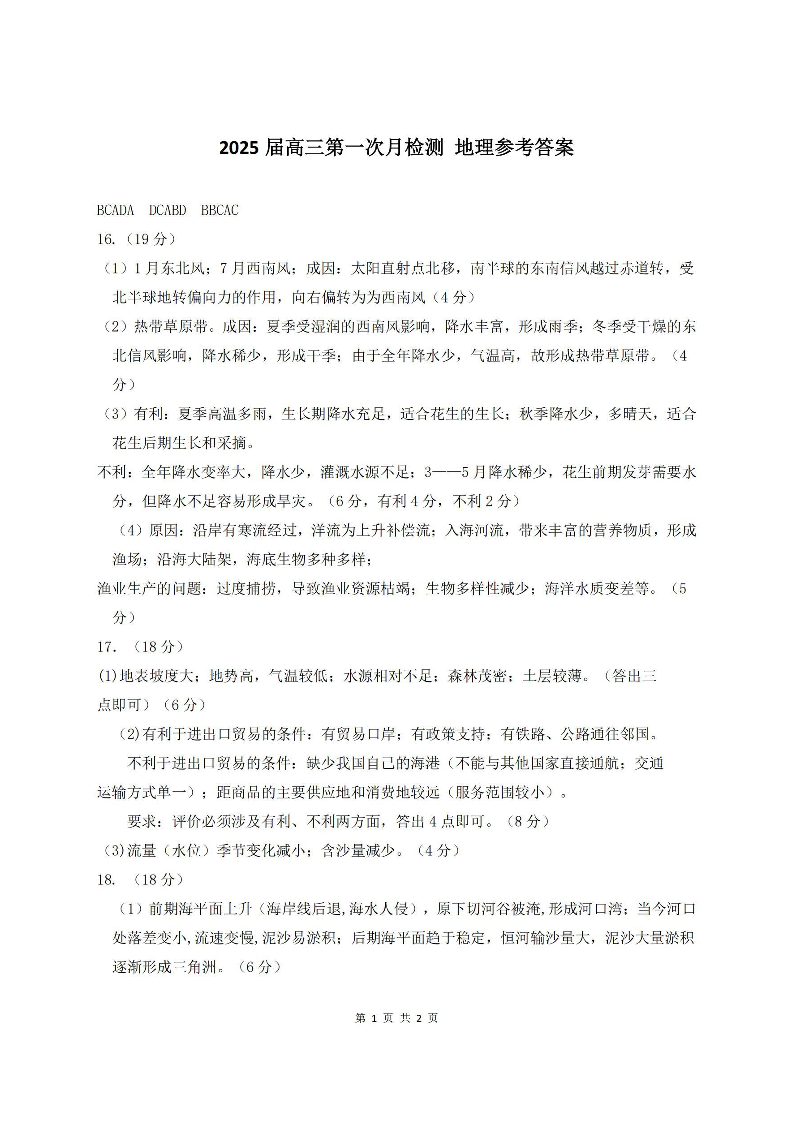 天津市南开中学2024-2025学年高三上学期10月月考地理答案